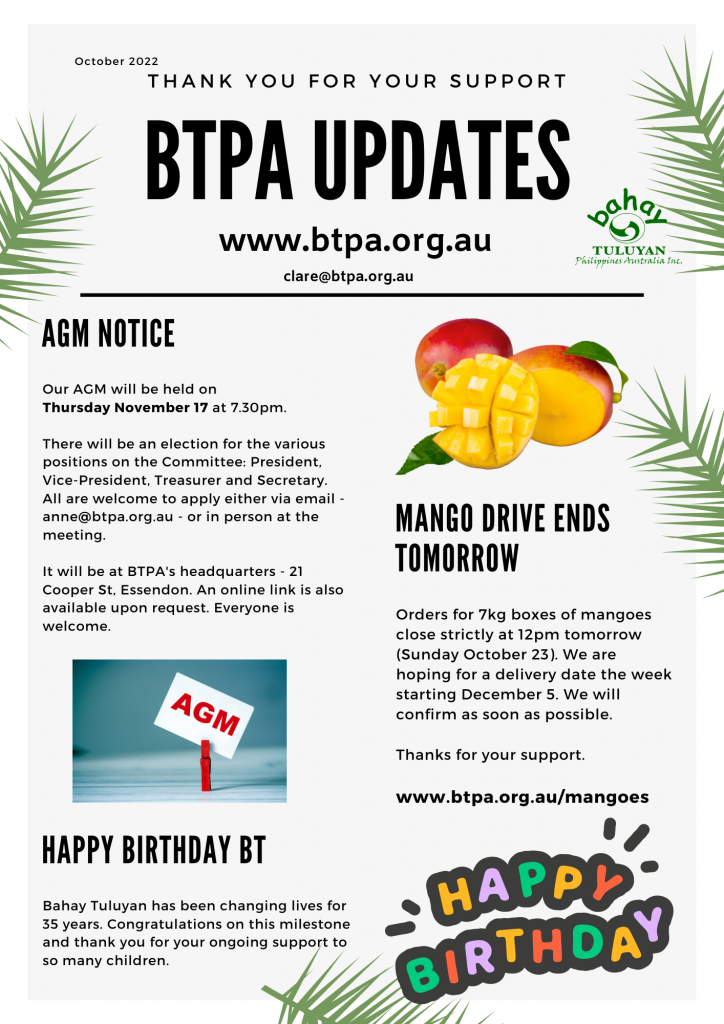 This is official notice that BTPA’s Annual General Meeting will be held on Thursday November 17, 2022 at 7.30pm